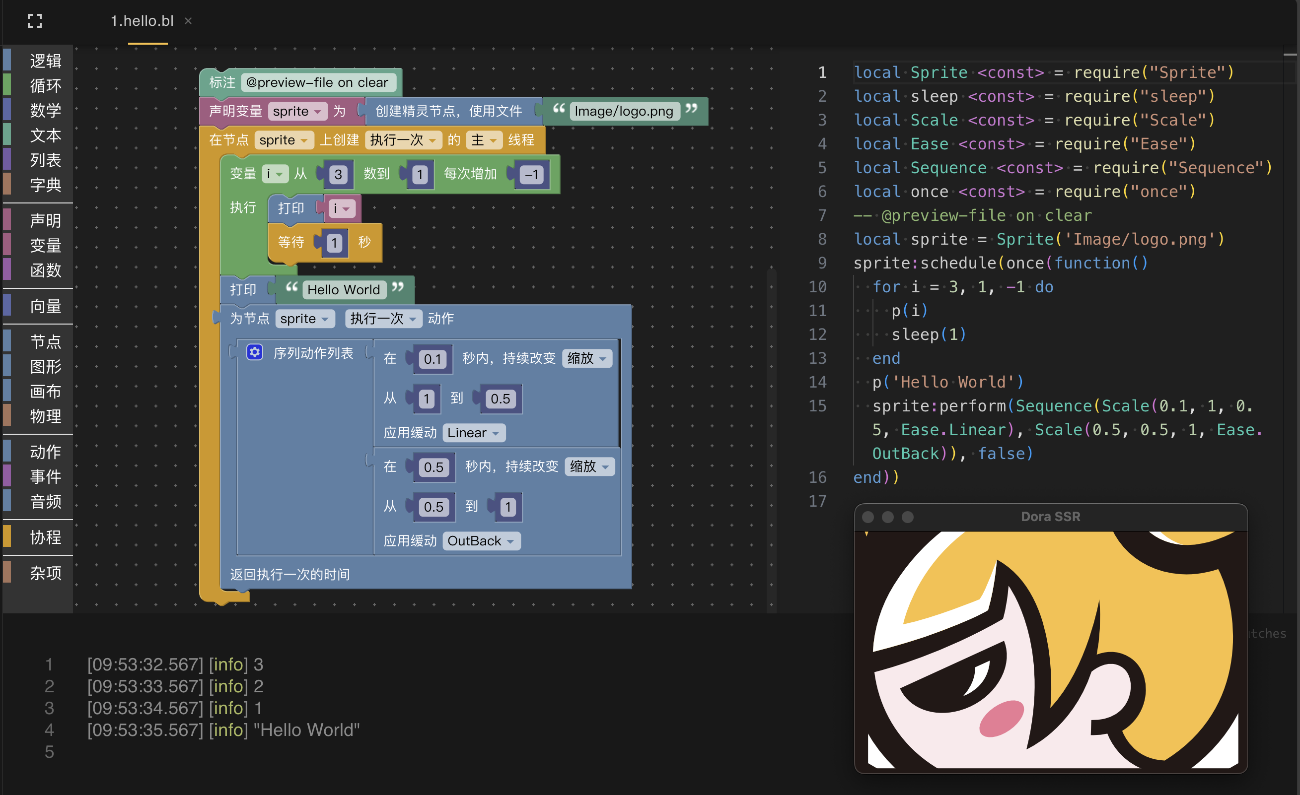 这就太适合我们了。因为 Dora SSR 本身就是一个以 Lua 为主要脚本语言的游戏引擎,Blockly 生成的 Lua 代码可以直接在 Dora 上运行,作为已经支持过多种编译到 Lua 的编程语言的 Dora,使用这个新语言工具一点也不“编程审美降级”。