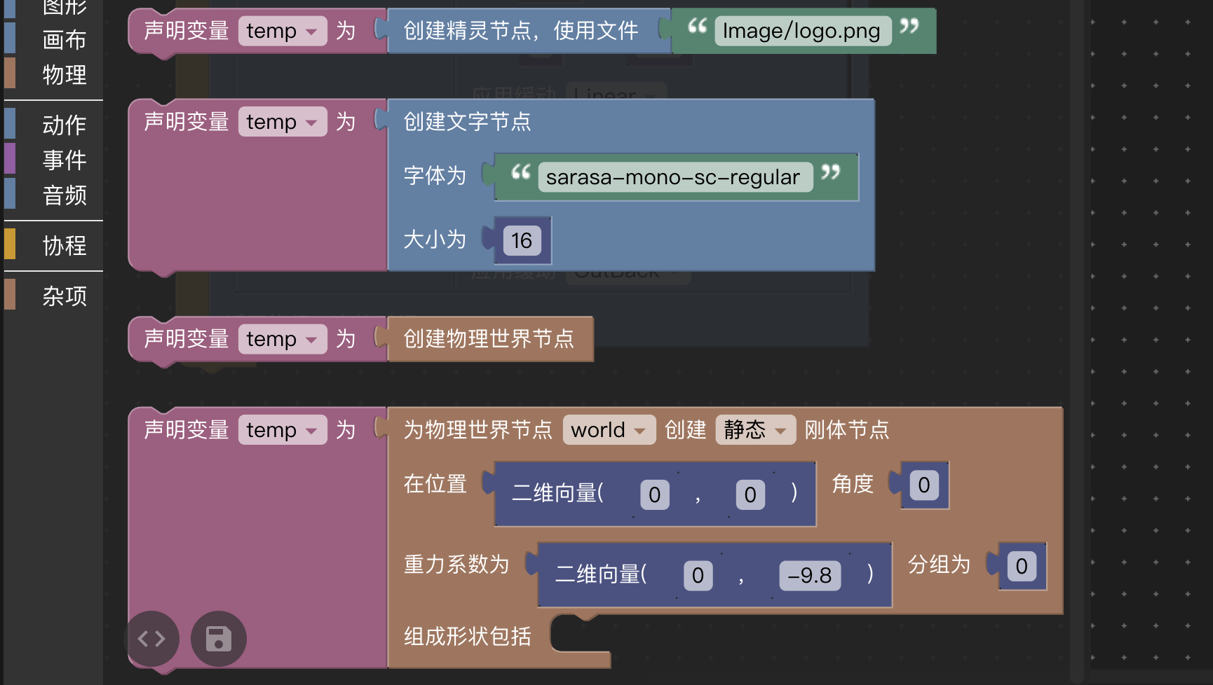 组合这些积木块,等于真的在写程序,不是“伪编程”,不是“模拟编程”,是真的可以 1:1 生成 Lua 源码、直接运行在 Dora SSR 上的专业程序!